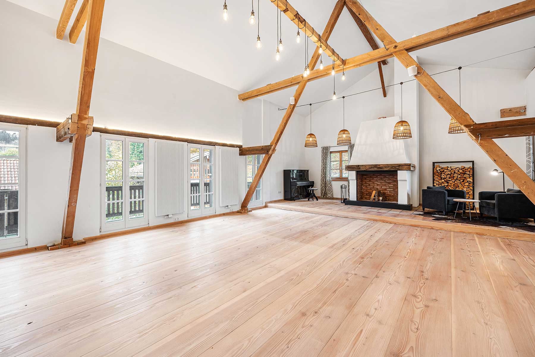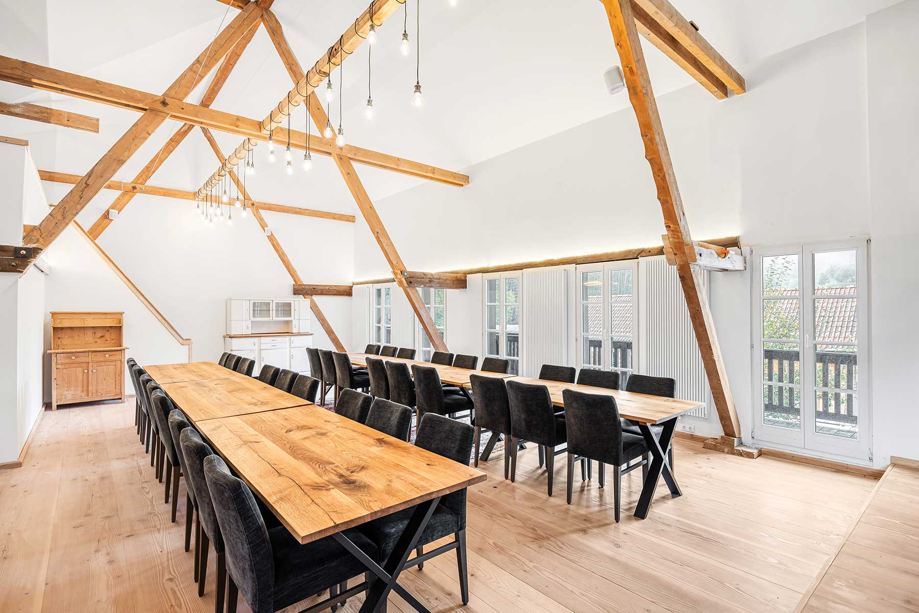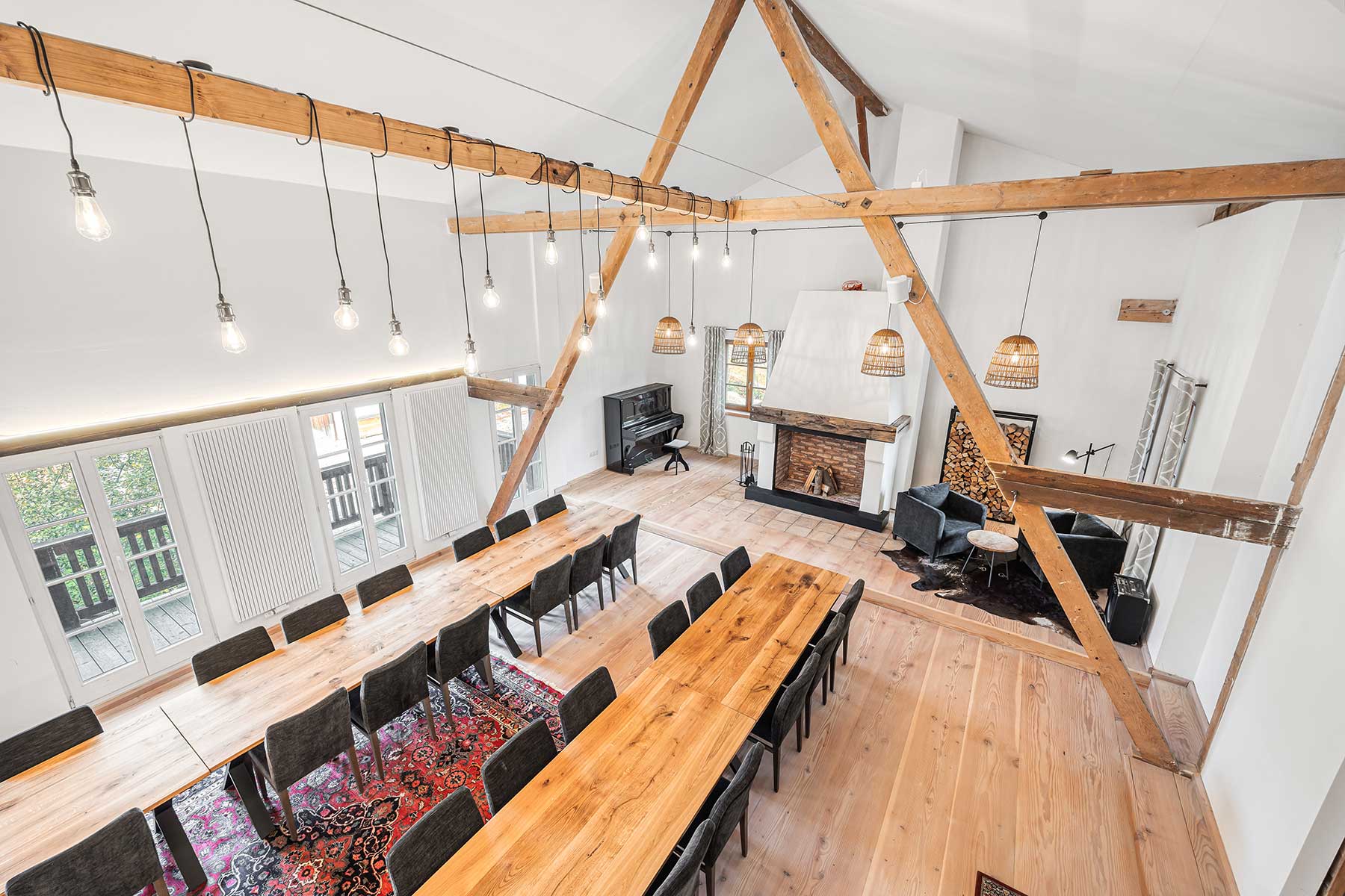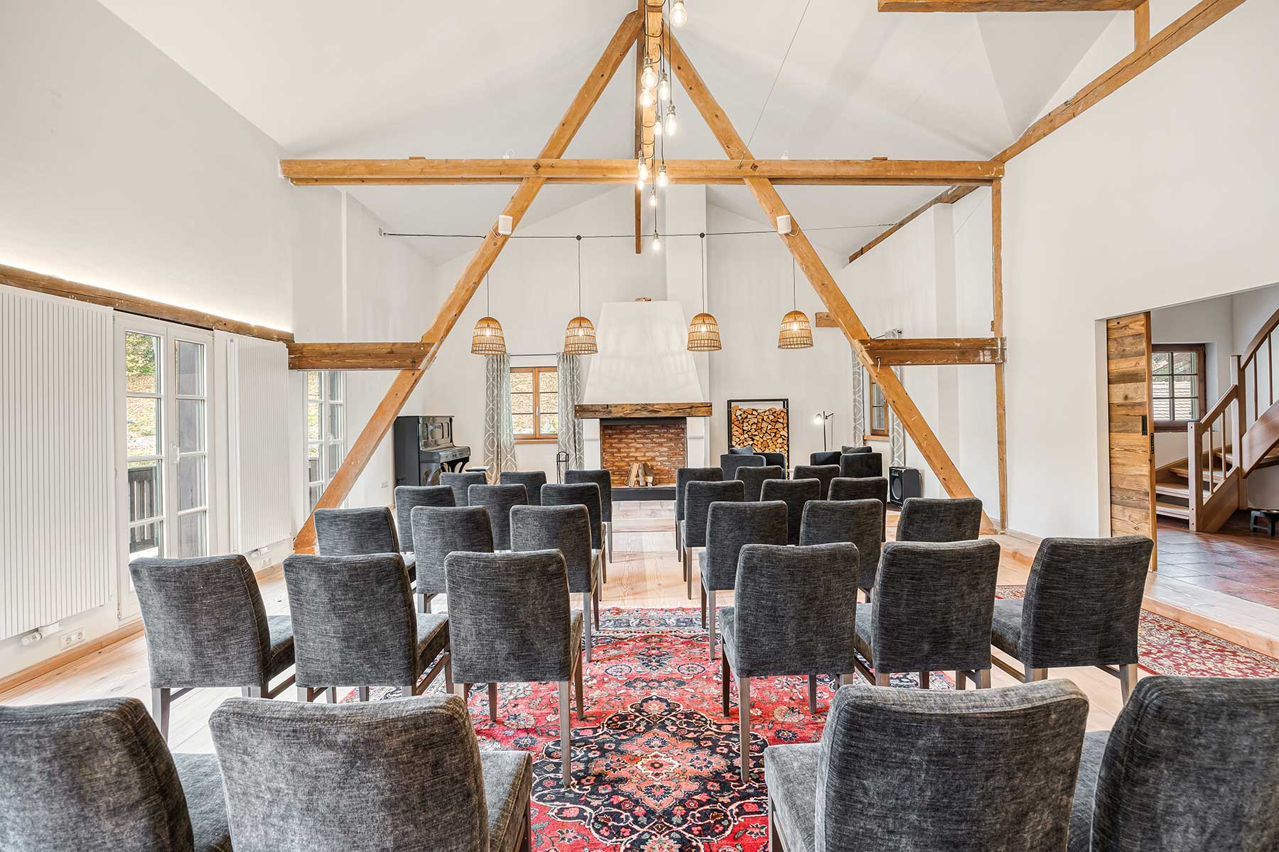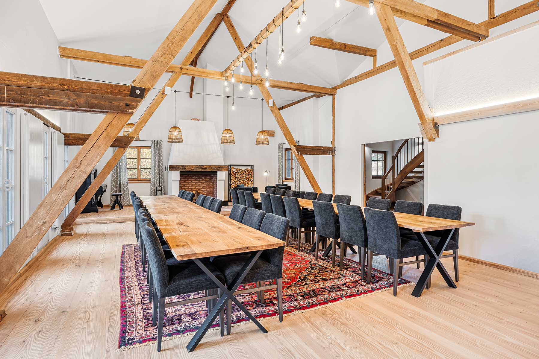 Unser knapp 90 qm grosser Saal eignet sich für viele Anlässe, da er sehr flexibel einzurichten ist. Bestuhlt mit Tischen und Stühlen oder auch nur mit einer Reihenbestuhlung haben Sie die Möglichkeit bis zu 40 Personen unterzubekommen. Der große Kamin ist natürlich nutzbar und verleiht dem Saal seinen besonderen Flair. Eine Sonos Soundanlage sorgt für eine gute Beschallung Ihrer Gäste.